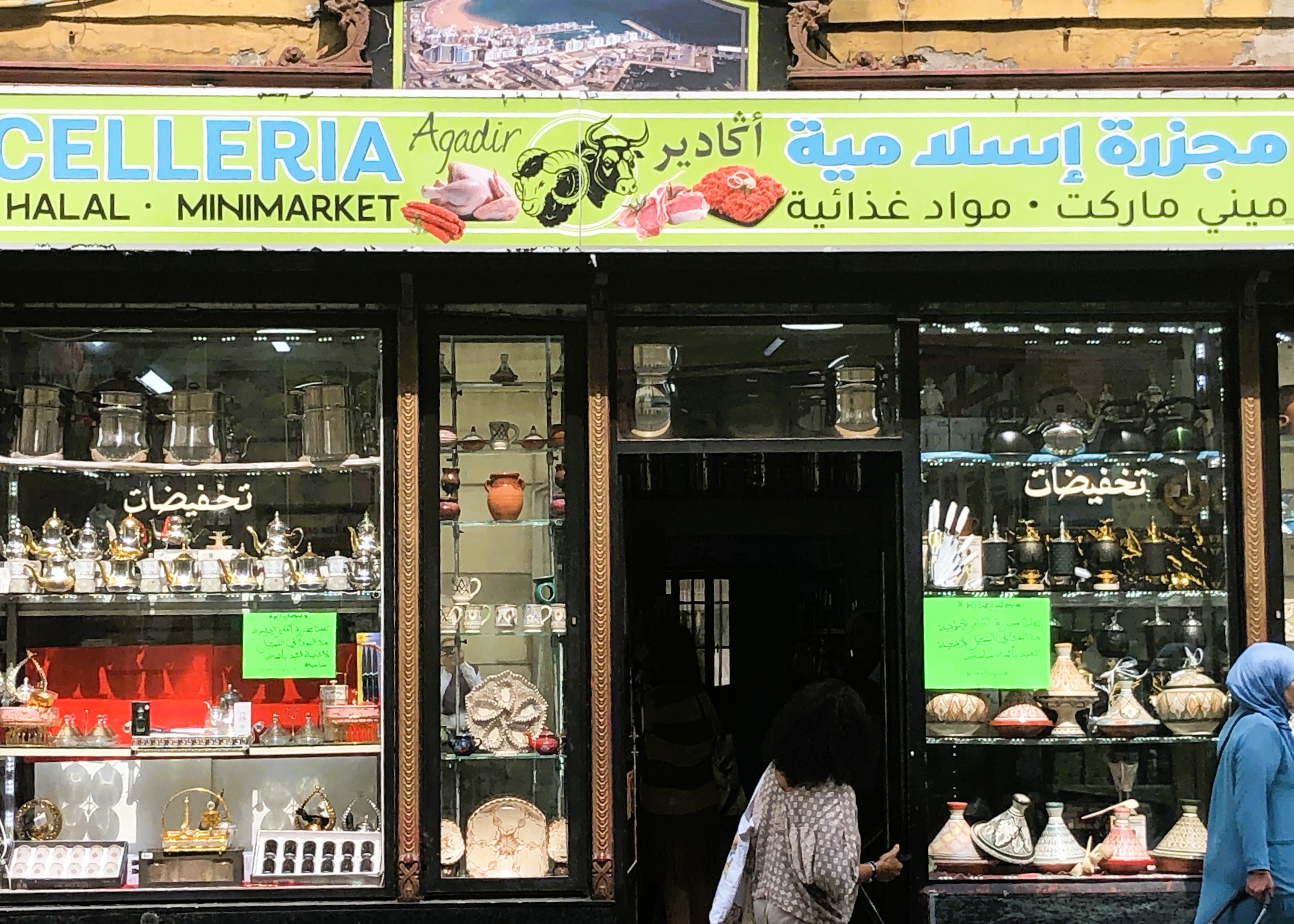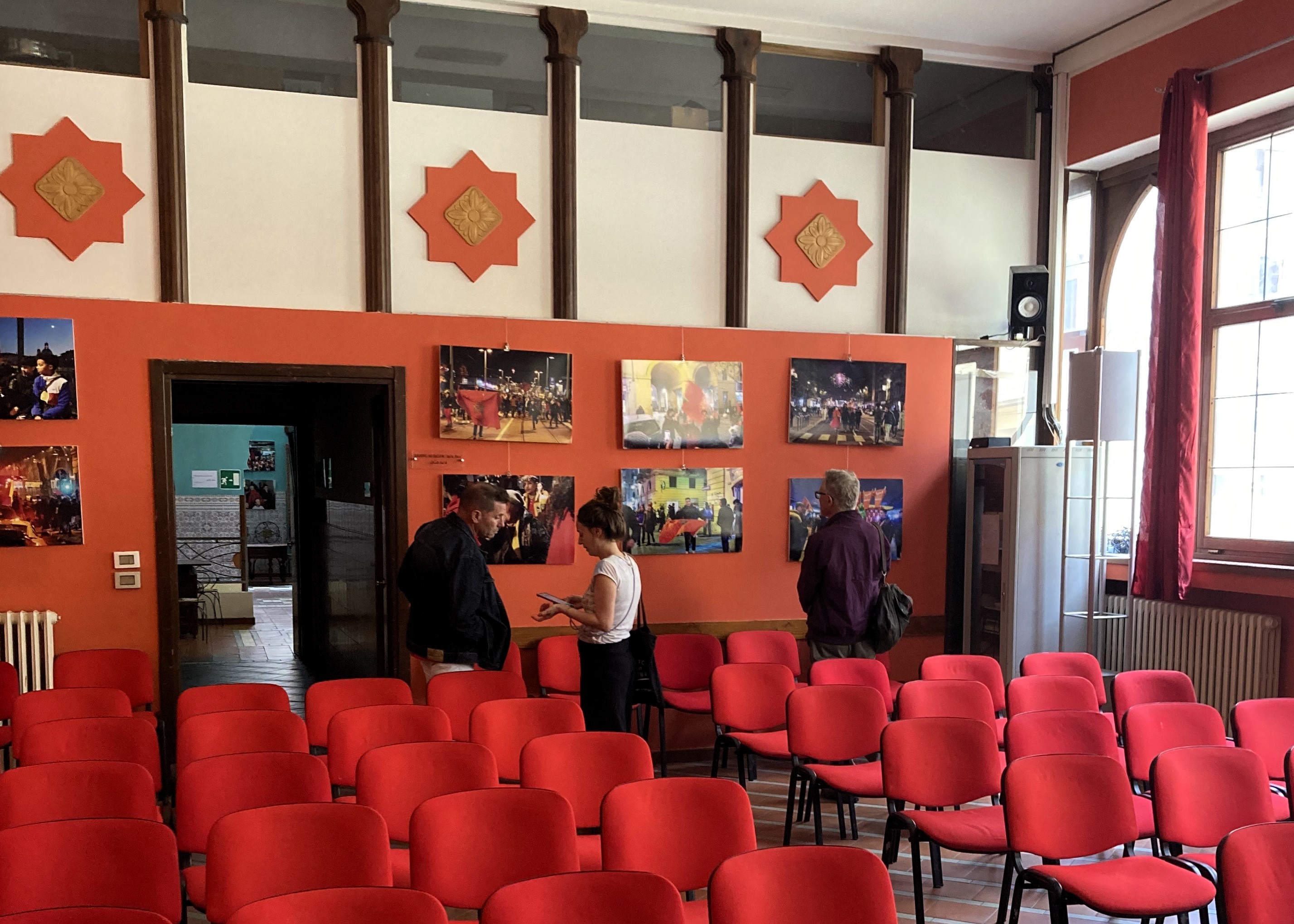 Hungry now, we head towards the Dar Al Hikma Cultural Center. The building is down-at-heel but beautiful inside, with grand staircases and ceilings. A small group of people is drinking tea at an ornate table. On the walls an exhibition of photographs taken during the football World Cup when the Moroccan national team progressed to the semi-final of the competition. The photographs show young supporters as they watch the football. The emotion is palpable. Other photographs show the ebullient joy of fans as they parade through the streets of Turin. Much in evidence are large flags of Morocco and red smoke from flares. Happy faces. Lunch is meatballs made from the produce of El Kheir butcher’s shop. Lentils and rice. Coffee. We discuss the morning’s encounters and share our thoughts.