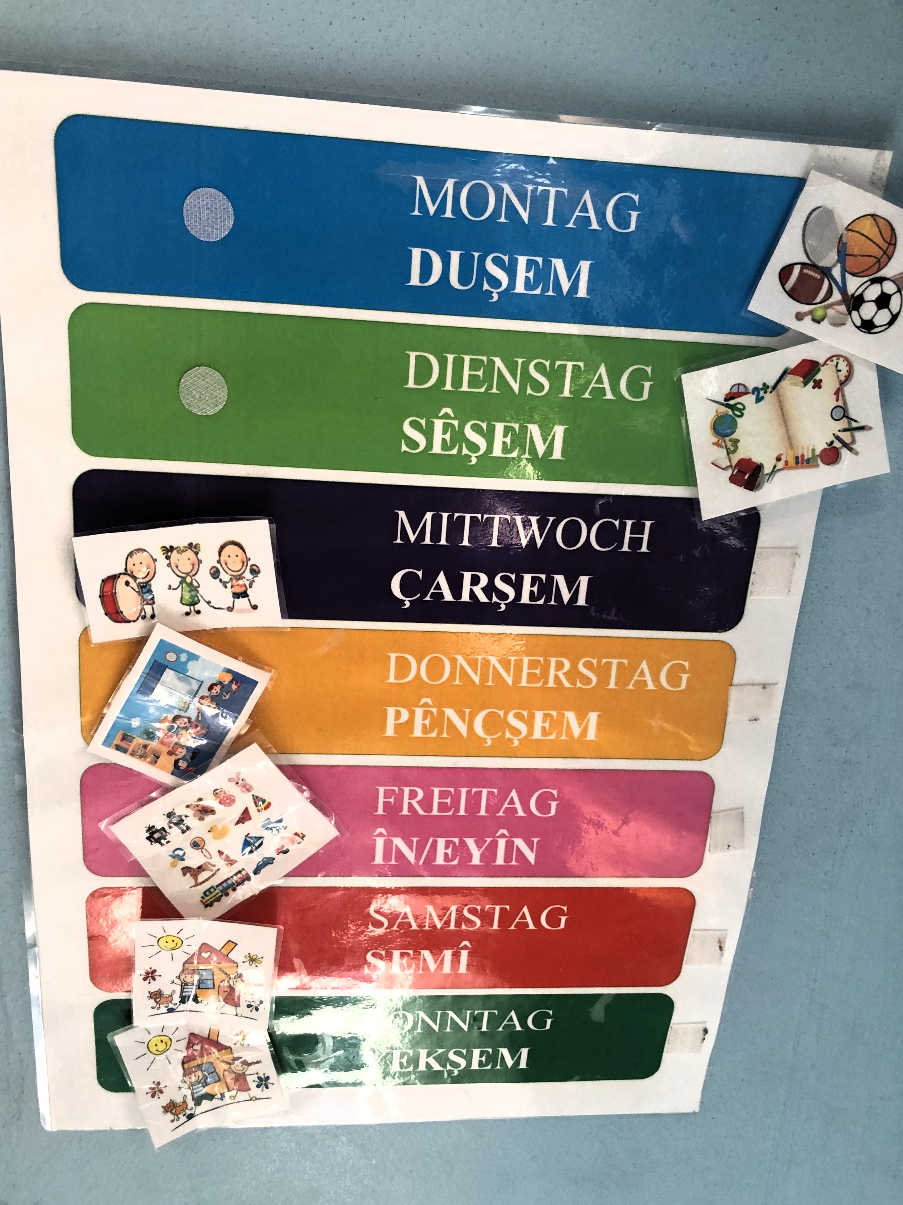 Katharina, Özgül, Barış, Angela and Adrian meet for breakfast. White cheese, honey, black olives, fresh bread. Barış Seyitvan talks about his extensive creative practice as an artist. Bariş is an independent Kurdish artist and curator from Diyarbakır, Turkey. He currently lives in Berlin. His professional experience spans 20 years of work with arts organisations, individual artists and nonprofits. His focus is on contemporary art and migration in the Middle East; his work explores the experience of the global Kurdish communities. Walk. Yekmal Kita Pîya Kreuzberg. The Pîya daycare centre is the first bilingual Kurdish-German kindergarten in the world. The name Pîya comes from the Kurdish-Zazakî language. Its meaning, together, emphasises the integrative and collaborative approach of the educational work that goes on here. Small children wash their hands before lunch. They are serious and also full of laughter. The staff of the kindergarten are relaxed and confident. There is an abundance of trust here. The Director of Yekmal, Günay Darıcı, discusses at length the aims and ambitions of the organisation. More tea. Walk. A thunderstorm interrupts a journey through the neighbourhood to visit an open-air space adopted by Yekmal. With a little relief a decision is made to forego lunch. An indoor market. Aromas of all kinds: spices, fruits, candies, confections. Back at the Family Centre, an impressive talk from Őzgűl Bendes about her personal experience of developing everyday language materials for children in Kurmancî. Flash cards, memory games, audio resources. The presentation prompts further discussion of language learning. Dinner at Restaurant Agora. Katharina, Mehdî & Sozdar & Aso, Özgül & Yaşar & Heval, Şilan, Sîdar, Angela, Adrian. Eclectic cuisine: Turkish, Arabic, Israeli, Greek, Lebanese, Kurdish. Research discussions late into the evening. Farewells, or at least adieus. The team disperses, goes its separate ways. For now.