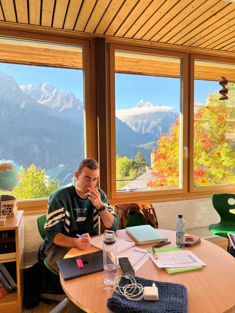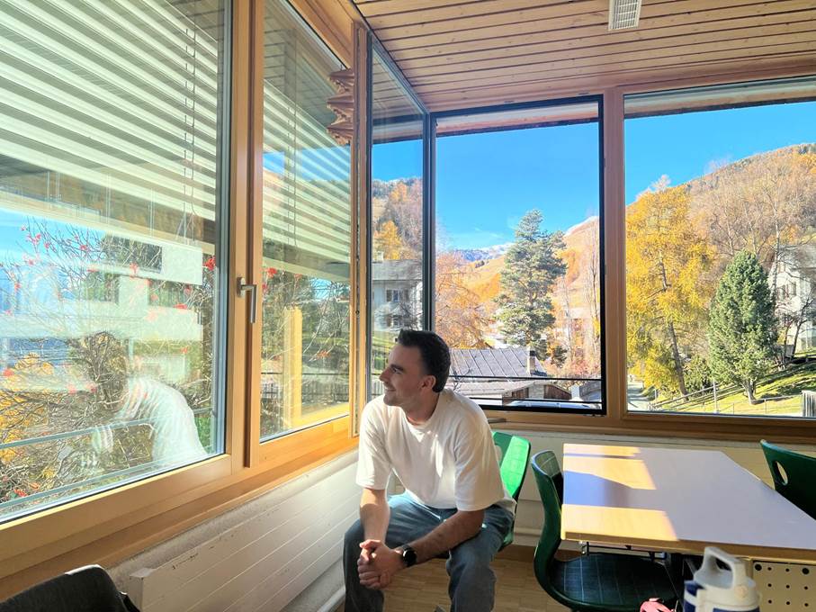 And here I am now. From the school window, I gaze at the mountains, whose peaks are already covered with a thin layer of snow. Below the tree line, the golden larch trees cast a warm glow over the landscape, bathing the mountains in golden light. Above, a deep blue sky stretches out, completing this natural spectacle.